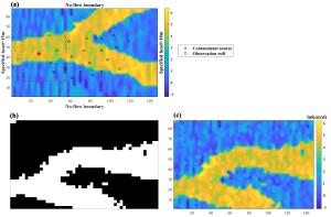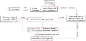 Abstract: When groundwater pollution occurs, to come up with an efficient remediation plan, it is particularly important to collect information of contaminant source (location and source strength) and hydraulic conductivity field of the site accurately and quickly. However, the information can not be obtained by direct observation, and can only be derived from limited measurement data. Data assimilation of observations such as head and concentration is often used to estimate parameters of contaminant source. As for hydraulic conductivity field, especially for complex non-Gaussian field, it can be directly estimated by geostatistics method based on limited hard data, while the accuracy is often not high. Better estimation of hydraulic conductivity can be achieved by solving inverse groundwater problem. Therefore, in this study, the multi-point geostatistics method Quick Sampling (QS) is proposed and introduced for the first time and combined with the iterative local updating ensemble smoother (ILUES) to develop a new data assimilation framework QS-ILUES. It helps to solve the contaminant source parameters and non-Gaussian hydraulic conductivity field simultaneously by assimilating hydraulic head and pollutant concentration data. While the pilot points are utilized to reduce the dimension of hydraulic conductivity field, the influence of pilot points' layout and the ensemble size of ILUES algorithm on the inverse simulation results are further explored.