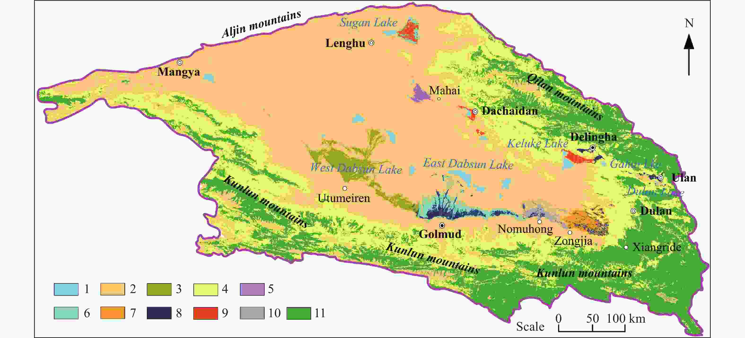 Note: 1-Lake; 2-Bare land; 3-It is mainly Phragmites australis, followed by Tamarix ramosissima Lcdcb, Nitraria tangutorum Bor; 4-It is mainly Artemisia desterorum Spreng, followed by Nitraria tangutorum Bobr, Calligonum mongolicum, Tamarix ramosissima Lcdcb and so on; 5-Tamarix ramosissima Lcdcb, Artemisia sphaerocephala; 6-Artemisia sphaerocephala; 7-Artemisia sphaerocephala, Tamarix ramosissima Lcdcb, Nitraria tangutorum Bor; 8-Woodland, farmland; 9-Grass land; 10-It is mainly Phragmites australis, followed by Tamarix ramosissima Lcdcb, Artemisia sphaerocephala, Calligonum mongolicum; 11-Alpine vegetation.