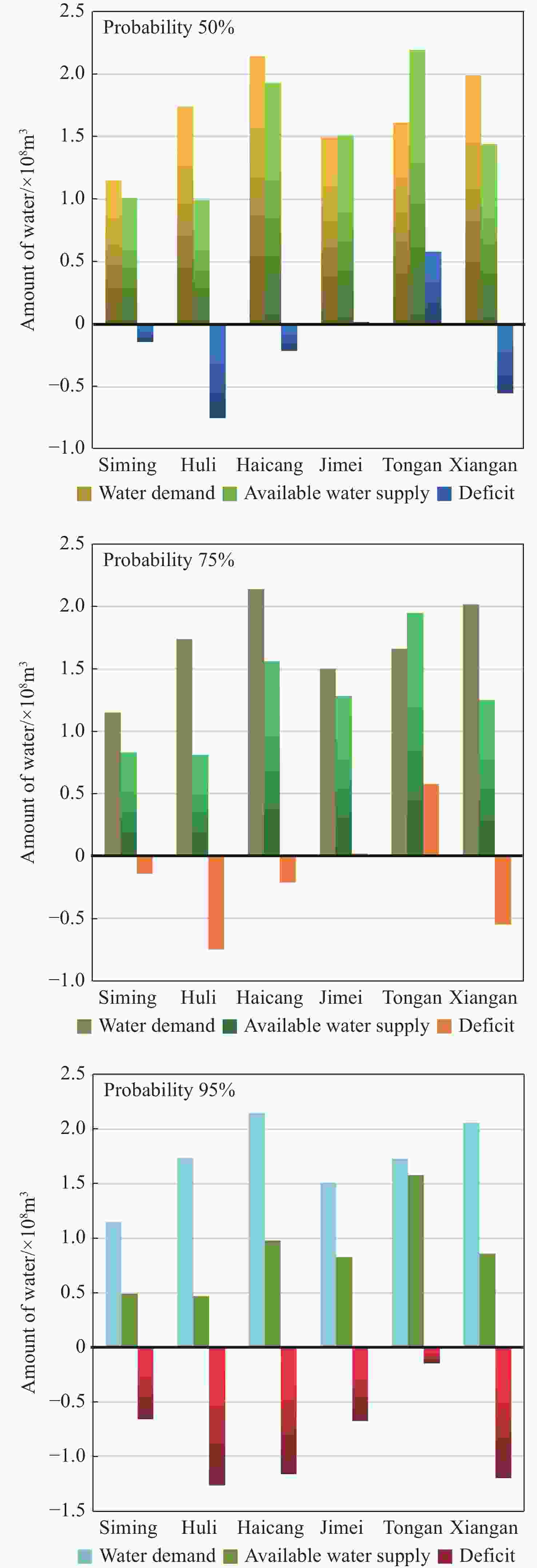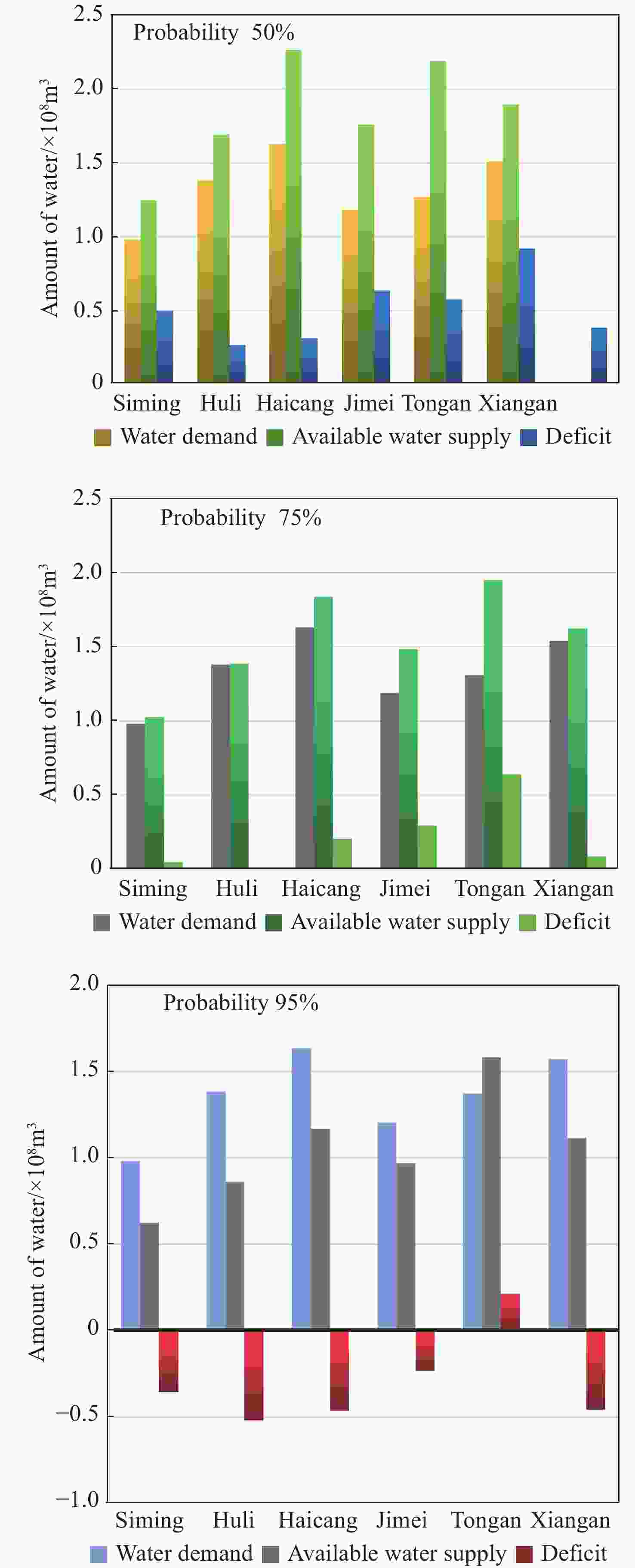 districtWater demand① Water available② Surplus③=②-① Water deficiency ratio% 50% 75% 95% 50% 75% 95% 50% 75% 95% 50% 75% 95% Siming 0.98 0.98 0.98 1.25 1.03 0.62 0.27 0.05 −0.36 −27.32 −4.60 36.61 Huli 1.38 1.38 1.38 1.69 1.39 0.86 0.31 0.01 −0.52 −22.70 −0.51 37.82 Haicang 1.63 1.63 1.63 2.27 1.84 1.17 0.64 0.21 −0.46 −39.07 −12.66 28.47 Jimei 1.18 1.19 1.2 1.76 1.48 0.97 0.58 0.29 −0.23 −48.95 −24.64 19.44 Tongan 1.27 1.31 1.37 2.19 1.95 1.58 0.92 0.64 0.21 −72.44 −48.85 −15.33 Xiangan 1.51 1.54 1.57 1.90 1.62 1.11 0.39 0.08 −0.46 −25.54 −5.44 29.21 Total 7.94 8.03 8.13 11.05 9.31 6.30 3.11 1.28 −1.83 −39.18 −15.88 22.51 -