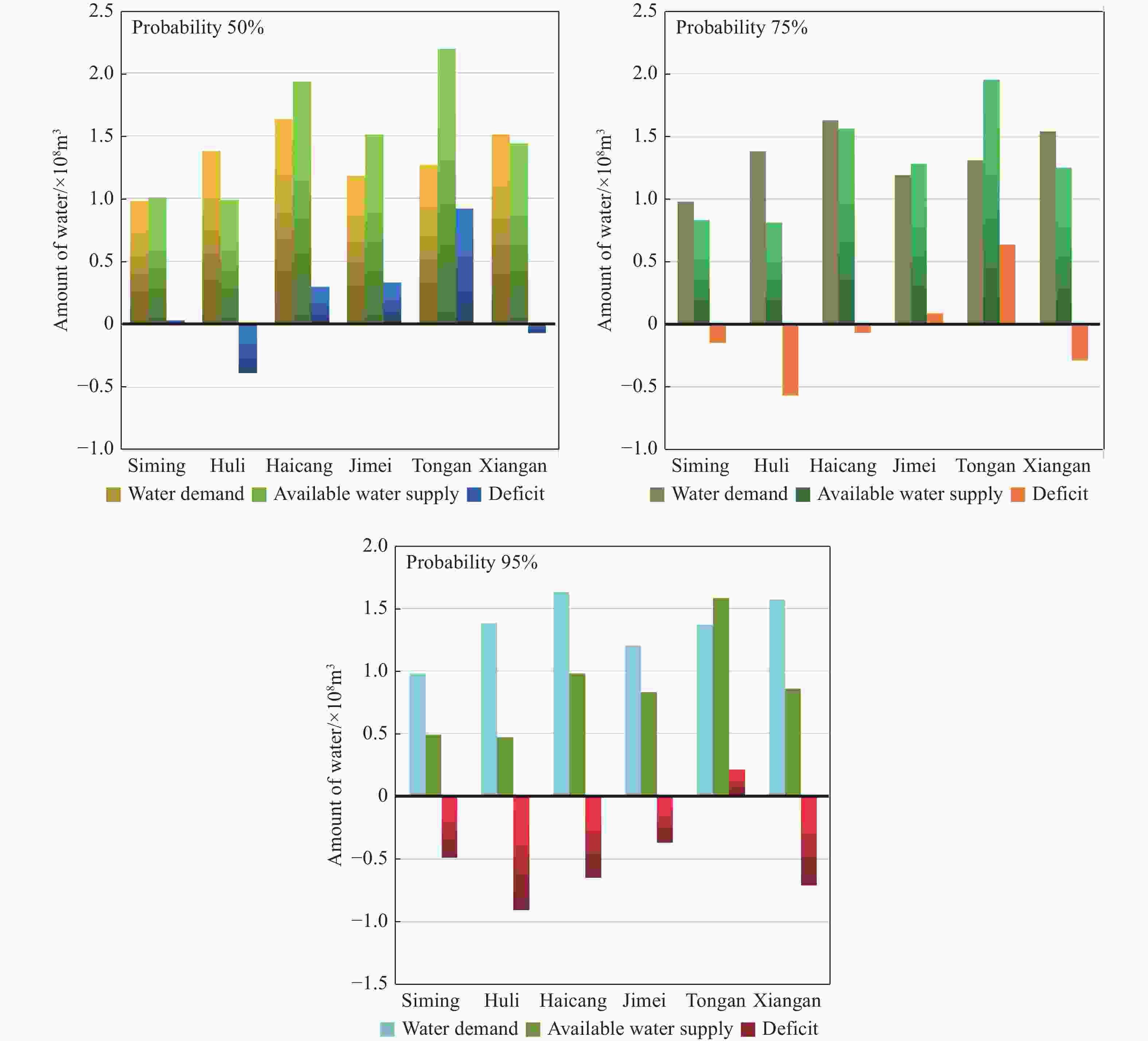Cheng XR, Ren LL, Yang XL, et al. 2015. Comparison of supply-demand planning schemes of water resources over Sanya River Basin. Water Resources Protection, 31(6): 5-10 (in Chinese). Diao WJ, Feng ZL, Liu XC, et al. 2017. Optimal Allocation of Water Resource in North of Weifang Based on Visual MODFLOW. Water Resources and Power, 35(4): 25-28. (in Chinese) Dong ZC. 2008. Water Resources Planning and Management. China Water & Power Press: Beijing. (in Chinese) Hao GL, Wang X, Luo Y, et al. 2017. Assessment of water shortage risk in Beijing based on improved comprehensive evaluation model. Water Resources Protection, 33(6): 27-31. ( in Chinese) Huang CL, Zheng CH. 2009. Spatial differentiation of water resources supply and demand balance in Fujian Province. Resources Science, 31(5): 750-756. (in Chinese) Kang AQ, Wei CJ, Xie XM, et al. 2011. Research and application on triple equilibrium law under the framework of water resources entire elements option allocation. Journal of China Institute of Water Resources and Hydropower Research, 9(3): 161-167. ( in Chinese) Lin PF, You JJ, Wang L, et al. 2016. Study on evaluation of effect from water-source connection on safety of urban water supply system. Water Resources and Hydropower Engineering, 47(01): 26-30, 40. ( in Chinese) Liu JX, Yuan WL, Kang AQ. 2011. Example analysis of the impact of typical and long series year calculation methods on water allocation results. Heilongjiang Science and Technology of Water Conservancy, 39(01): 159-160, 170. (in Chinese) Margaret WG, Li CC, Mohamed Sayeed, et al. 2011. Watershed modeling using large-scale distributed computing in condor and the soil and water assessment tool model. Simulation Transactions of the Society for Modeling & Simulation International, 88(3): 365-380. doi: 10.1177/0037549711402524 Qian ZY. 2001. Study on China’s water resources strategy for sustainable development. China Water & Power Press. (in Chinese) Read L, Madani K, Inanloo B. 2014. Optimality versus stability in water resource allocation. Journal of Environmental Management, 133: 343-354. doi: 10.1016/j.jenvman.2013.11.045 Shi H. 2002. The state of global water resource and the problems of water environment in China. Research of Soil and Water Conservation, 9(1): 145-150. (in Chinese) Wang H, Qin DY, Wang JH, et al. 2003. Study on the rational allocation of water resources in the Yellow Huaihai Basin. Science Press: Beijing. (in Chinese) Xie JY, Chen X, Xu Q. 2020. Impact of urbanization on water resources vulnerability in Amoy City. International Journal Hydroelectric Energy, 28(6): 19-21, 59. ( in Chinese) Xu XQ. 1999. Desalination of seawater is most effective way to solve water shortage in Amoy. Journal of Oceanography in Taiwan Strait, 18(4): 450-455. (in Chinese) -
