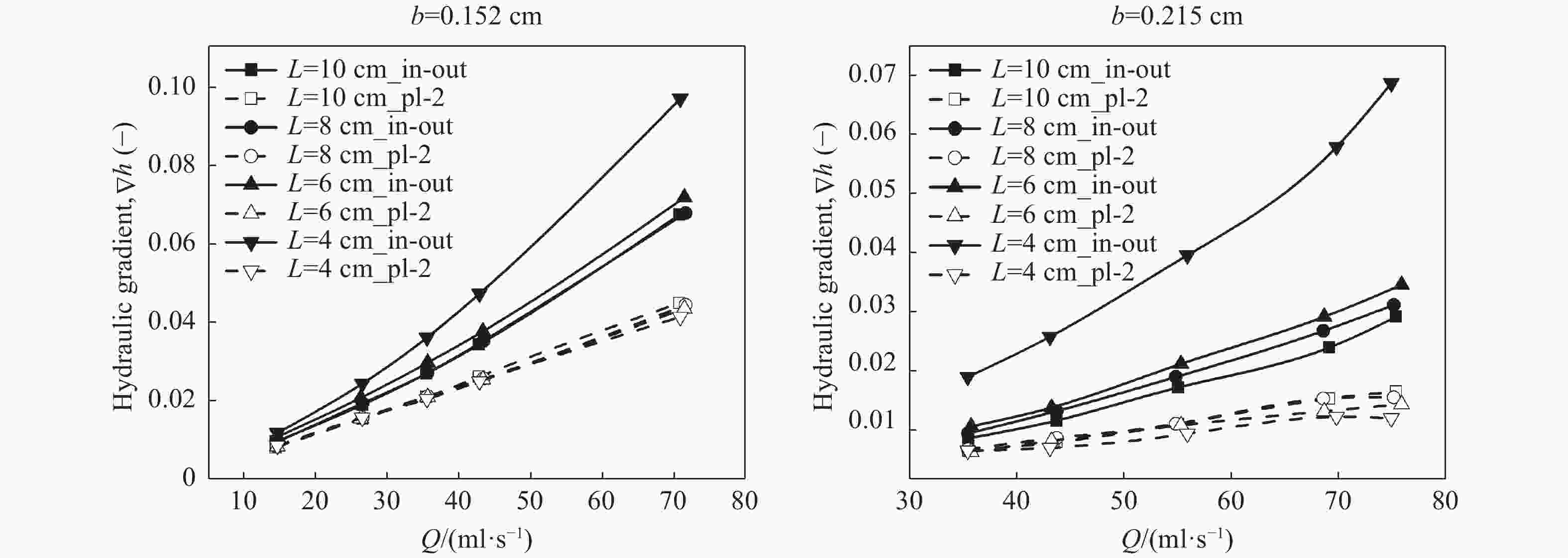 Parameters Units Values Boundary (flow in and flow out) Length (L) cm 10, 8, 6, 4 corresponding with each experiment Specified flux (Q) cm3/s corresponding with each experiment Aperture (b) cm 0.215, 0.125 corresponding with each experiment Reference fluid density ($ \rho ) $ kg/cm3 9.98E-4 Reference fluid viscosity (μ) kg/(cm·s) 9.53E-6 Acceleration due to gravity ($ g $) cm/s2 9.81E+2 Table 2. The experimental results of