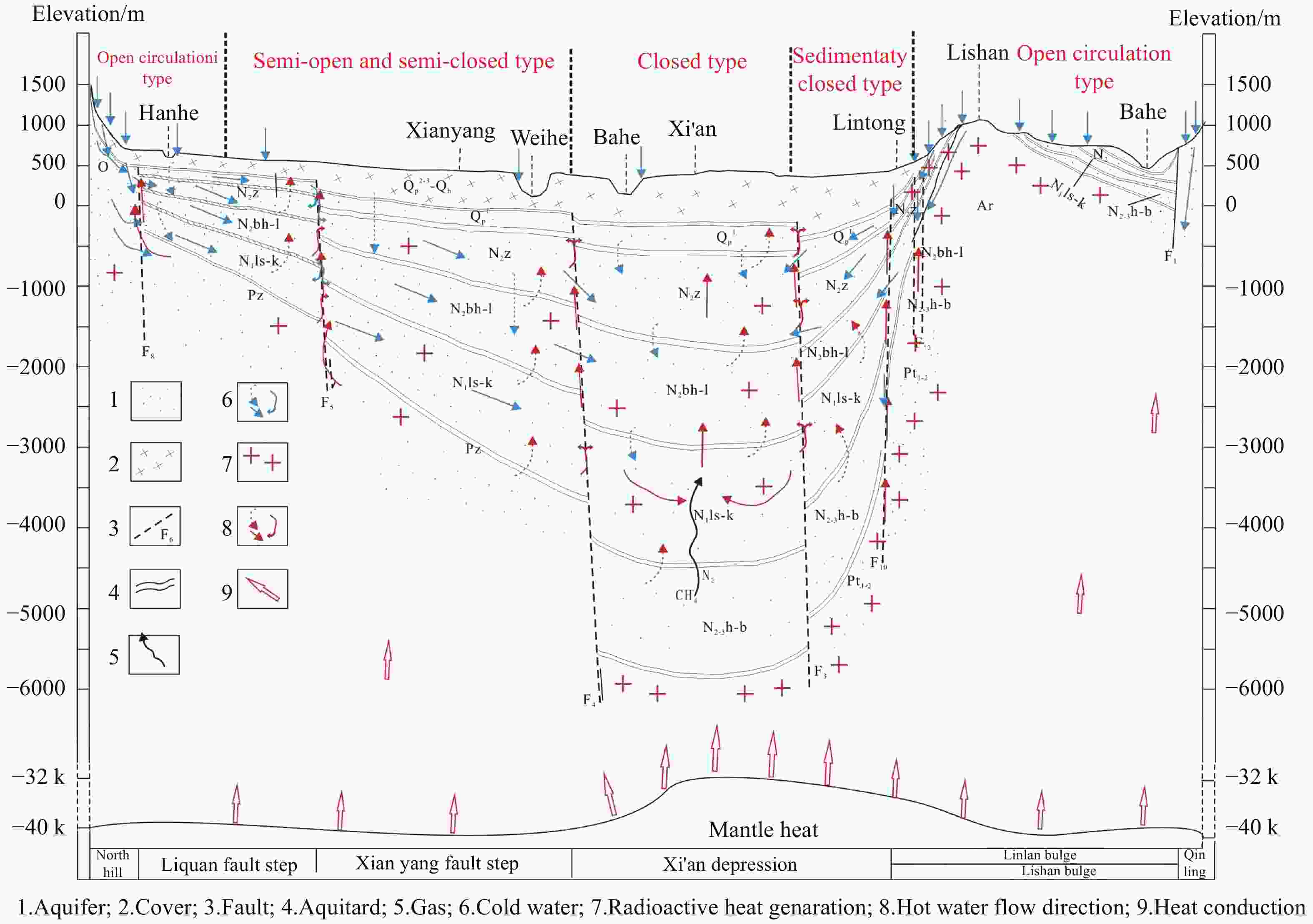 Abstract: Guanzhong Basin is a typical medium-low temperature geothermal field mainly controlled by geo-pressure in the west of China. The characteristics of hydrogen and oxygen isotopes were used to analyze the flow and storage modes of geothermal resources in the basin. In this paper, the basin was divided into six geotectonic units, where a total of 121 samples were collected from geothermal wells and surface water bodies for the analysis of hydrogen-oxygen isotopes. Analytical results show that the isotopic signatures of hydrogen and oxygen throughout Guanzhong Basin reveal a trend of gradual increase from the basin edge areas to the basin center. In terms of recharge systems, the area in the south edge belongs to the geothermal system of Qinling Mountain piedmont, while to the north of Weihe fault is the geothermal system of North mountain piedmont, where the atmospheric temperature is about 0.2℃-1.8℃ in the recharge areas. The main factors that affect the geothermal water δ18O drifting include the depth of geothermal reservoir and temperature of geothermal reservoir, lithological characteristics, water-rock interaction, geothermal reservoir environment and residence time. The δ18O-δD relation shows that the main source is the meteoric water, together with some sedimentary water, but there are no deep magmatic water and mantle water which recharge the geothermal water in the basin. Through examining the distribution pattern of hydrogen-oxygen isotopic signatures, the groundwater circulation model of this basin can be divided into open circulation type, semi-open type, closed type and sedimentary type. This provides some important information for rational exploitation of the geothermal resources.