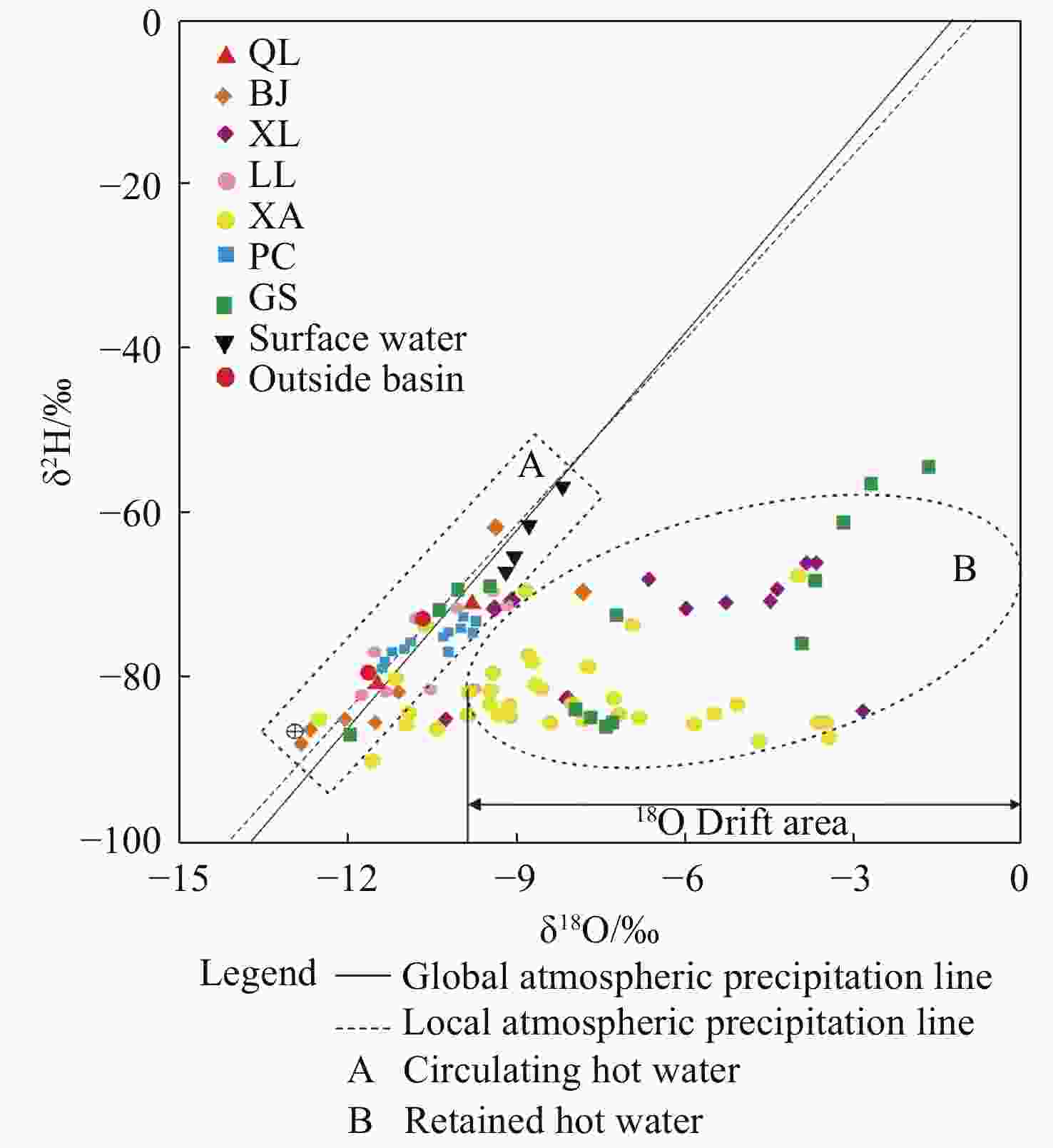 Chandrajith R, Barth JAC, Subasinghe ND, et al. 2013. Geochemical and isotope characterization of geothermal spring waters in Sri Lanka: Evidence for steeper than expected geothermal gradients. Journal of Hydrology, 476: 360-369. doi: 10.1016/j.jhydrol.2012.11.004 Clayton RN, Steiner A. 1975. Oxygen isotope studies of the geothermal system at Wairakei, New Zealand. Geochimicaet Cosmochimica Acta, 39(8): 1179-1186. doi: 10.1016/0016-7037(75)90059-9 Craig H. 1961. Isotopic variations in meteoric waters. Science, 133(3465): 1702-1703. doi: 10.1126/science.133.3465.1702 Craig H. 1966. Isotopic composition and origin of the Red Sea and Salton Sea geothermal brines. Science, 154(3756): 1544-1548. doi: 10.1126/science.154.3756.1544 Dansgaard W. 1964. Stable isotopes in precipitation. Tellus, 15(4): 436-468. Diamond RE, Harris C. 2000. Oxygen and hydrogen isotope geochemistry of thermal springs of the Western Cape, South Africa: Recharge at high altitude? Journal of African Earth Sciences, 31(3): 467-481. Dotsika E, Poutoukis D, Raco B. 2010. Fluid geochemistry of the Methana Peninsula and Loutraki geothermal area, Greece. Journal of Geochemical Exploration, 104(3): 97-104. doi: 10.1016/j.gexplo.2010.01.001 Dotsika E. 2012. Isotope and hydrochemical assessment of the Samothraki Island geothermal area. Journal of Volcanology and Geothermal Research, 233-234: 18-26. doi: 10.1016/j.jvolgeores.2012.04.017 Giggenbach WF, Glover RB. 1992. Tectonic regime and major processes governing the chemistry of water and gas discharges from the Rotorua geothermal field, New Zealand. Geothermics, 21(1-2): 121-140. doi: 10.1016/0375-6505(92)90073-I Guo Q, Pang ZH, Wang YC, et al. 2017. Fluid geochemistry and geothermometry applications of the Kangding high-temperature geothermal system in Eastern Himalayas. Applied Geochemistry, 81: 63-75. doi: 10.1016/j.apgeochem.2017.03.007 Hu Y, Ma ZY, Yu J, et al. 2009. Estimation of the making-up temperature of geothermy water and the thermal reservoir temperature in Guanzhong Basin. Journal of Earth Sciences and Environment, 31(02): 173-176. Jiao T, Zpab C, YwabC, et al. 2019. Fluid geochemistry of the Cuopu high temperature geothermal system in the eastern Himalayan syntaxis with implication on its genesis. Applied Geochemistry, 110: 104422. doi: 10.1016/j.apgeochem.2019.104422 Jiang G, Gao P, Rao S, et al. 2017. Compilation of heat flow data in the continental area of China (4th edition). Chinese journal of geophysics-chinese edition, 59(7): 2892-2910. Komatsu S, Okano O, Ueda A. 2021. Chemical and isotopic (H, O, S, and Sr) analyses of groundwaters in a non-volcanic region, Okayama prefecture, Japan: Implications for geothermal exploration. Geothermics, 91: 102005. doi: 10.1016/j.geothermics.2020.102005 Li XC, Ma ZY, Zhang XL, et al. 2016. Genetic model of the Dongda geothermal field in Guanzhong Basin, Shaanxi Province. Geology in China, 43(06): 2082-2091. Liu F, Jin H, Mu G. 2009. Investigation and evaluation report of geothermal resources in Guanzhong Basin. Shaanxi Province. Xi’an: Shaanxi Institute of Geo-Environment Monitoring. Luo L, Pang ZH, Liu JX, et al. 2017. Determining the recharge sources and circulation depth of thermal waters in Xianyang geothermal fifield in Guanzhong Basin: The controlling role of Weibei Fault. Geothermics, 69: 55-64. Majumdar N, Majumdar RK, Mukherjee AL, et al. 2005. Seasonal variations in the isotopes of oxygen and hydrogen in geothermal waters from Bakreswar and Tantloi, Eastern India: Implications for groundwater characterization. Journal of African Earth Sciences, 25(2): 269-278. Majumdar N, Mukherjee AL, Majumdar RK. 2009. Mixing hydrology and chemical equilibria in Bakreswar geothermal area, Eastern India. Journal of Volcanology and Geothermal Research, 183(3): 201-212. Ma Y. 2007. Water-rock interaction and genesis of low-medium temperature thermal groundwater in carbonate reservoir. China University of Geosciences. Ma ZY, Zhang XL, He D, et al. 2016. A study of 36Cl age for the deep geothermal water in the Guanzhong Basin. Hydrogeology and Engineering Geology, 43(01): 157-163. Ma ZY, Fang JJ, Niu GL, et al. 2006. Classification of thermal water in Guanzhong Area, Shaanxi Province. Coal GeolExplor, 33: 54-58. Ma ZY, Wang XG, Su Y, et al. 2008. Oxygen and hydrogen isotope exchange and its controlling factors in subsurface geothermal waters in the central Guanzhong Basin, Shaanxi, China. Geological Bulletin of China, 27(06): 888-894. Pang ZH, Fan ZC, Wang JX. 1990. The study on stable oxygen and hydrogen isotopes in the Zhangzhou Basin hydrothermal system. Acta Petrol Sin, 11(04): 75-84. Pinti DL, Castro MC, Shoaukar-Stash O, et al. 2013. Evolution of the geothermal fluids at Los Azufres, Mexico, as traced by noble gas isotopes, δ18O, δD, δ13C and 87Sr/86Sr. Volcanology and Geothermal Research, 249: 1-11. doi: 10.1016/j.jvolgeores.2012.09.006 Pinti D L, Shouakar-Stash O, Castro M C, et al. 2020. The bromine and chlorine isotopic composition of the mantle as revealed by deep geothermal fluids. Geochimica et Cosmochimica Acta, 276: 14-30. doi: 10.1016/j.gca.2020.02.028 Qin DJ, Pan ZH, Turner JV, et al. 2005. Isotopes of geothermal water in Xi’an area and implications on its relation to karstic groundwater in North Mountains. Acta Petrologica Sinica, 21(05): 1489-1500. Richard L, Pinti D L, Helie J F, et al. 2019. Variability of deep carbon sources in Mexican geothermal fluids. Journal of Volcanology & Geothermal Research, 370(1): 1-12. Singh P, Mukherjee S. 2019. Chemical signature detection of groundwater and geothermal waters for evidence of crustal deformation along fault zones. Journal of Hydrology, 582(4): 124459. Sun HL, Ma F, Liu Z, et al. 2015. The distribution and enrichment characteristics of fluoride in geothermal active area in Tibet. China Environmental Science, 35(01): 251-259. Sun HL, Ma F, Lin WJ, et al. 2015. Geochemical characteristics and application of geothermal temperature scales of high-temperature geot