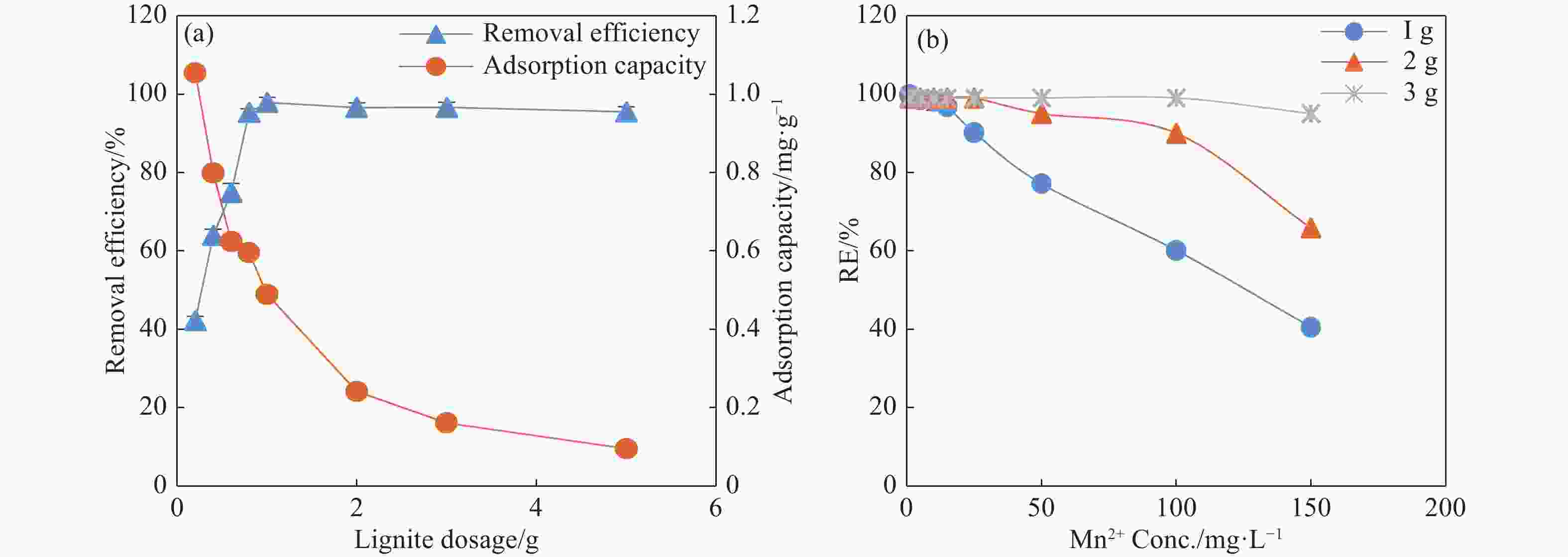 Figure  3.  The impact of (a) BC dosage and (b) initial Mn2+ concentration on Mn2+ adsorption