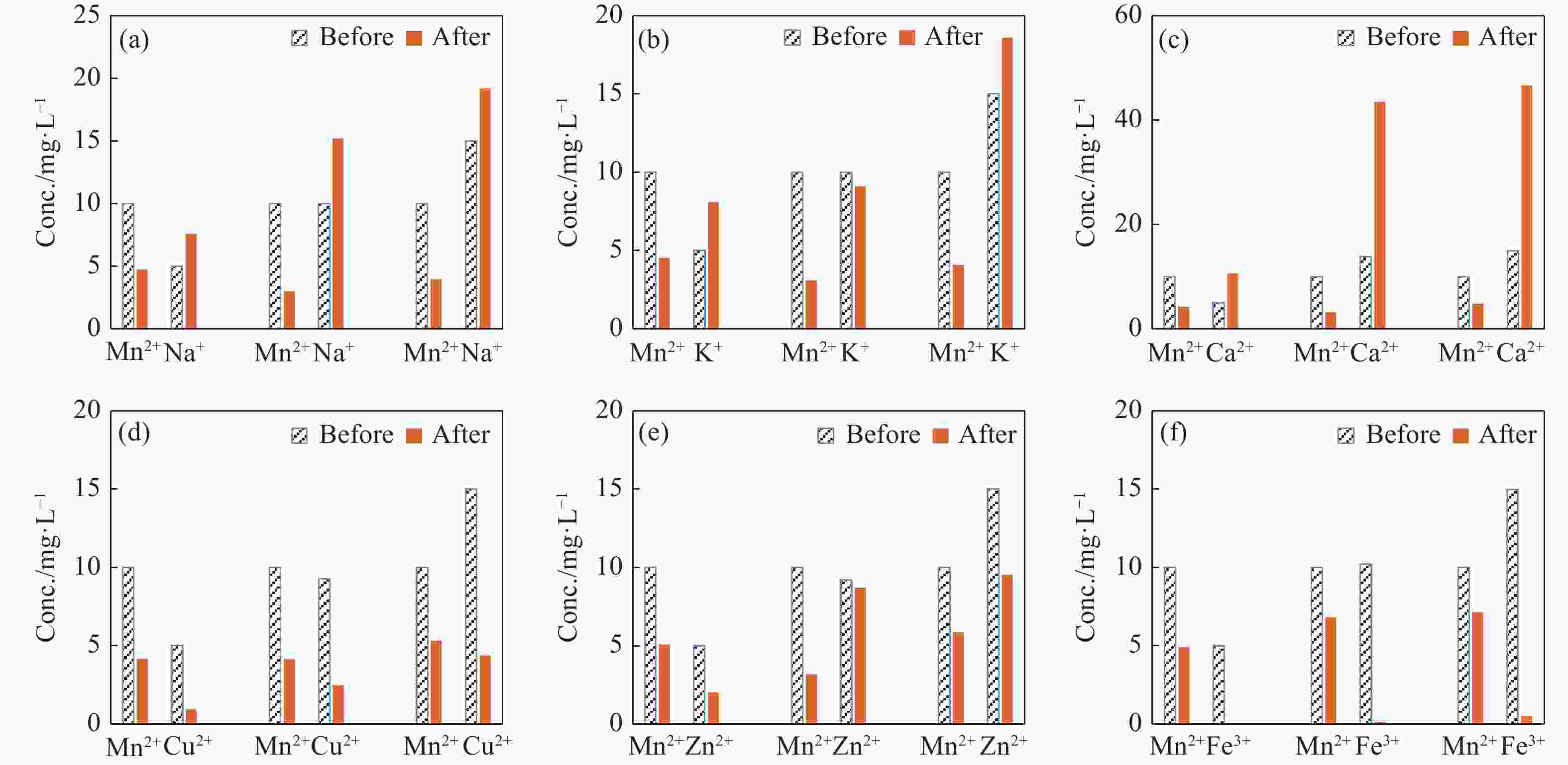 Figure  4.  Effect of coexisting ions (Na+, K+, Ca2+, Cu2+, Zn2+, Fe3+ at concentrations of 5 mg/L, 10 mg/L, and 15 mg/L) on Mn2+ adsorption by BC