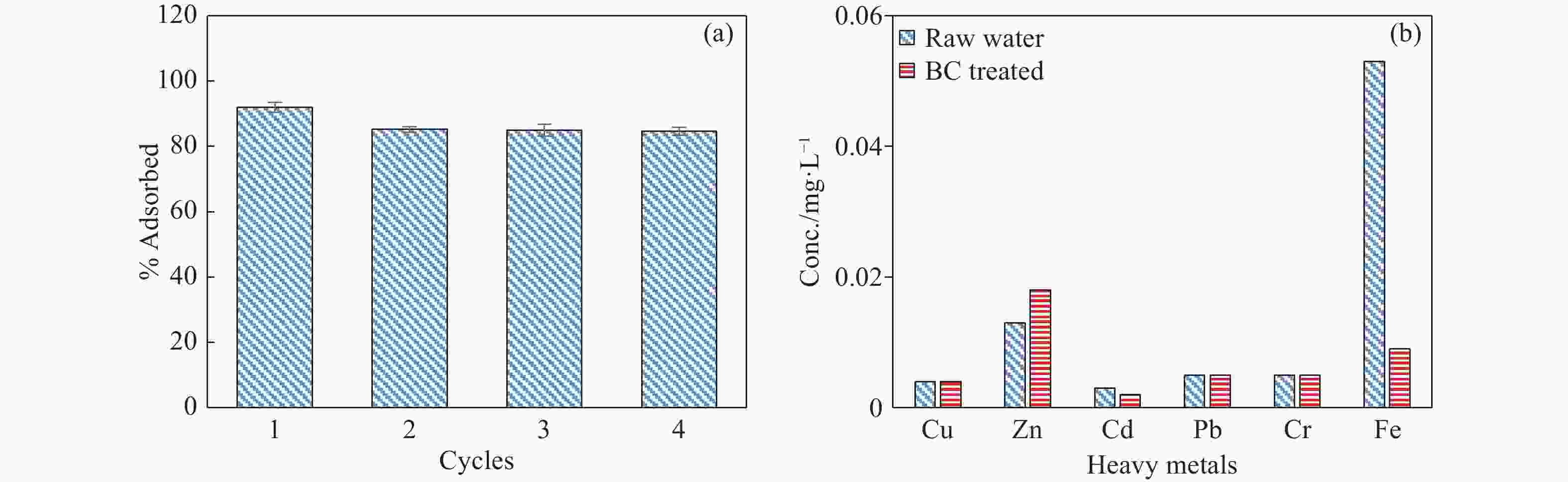 Figure  7.  Results of experiments to study (a) the reusability of the BC, and (b) the environmental benignity of the BC (Adsorbent mass: 1 g; pH = 6)
