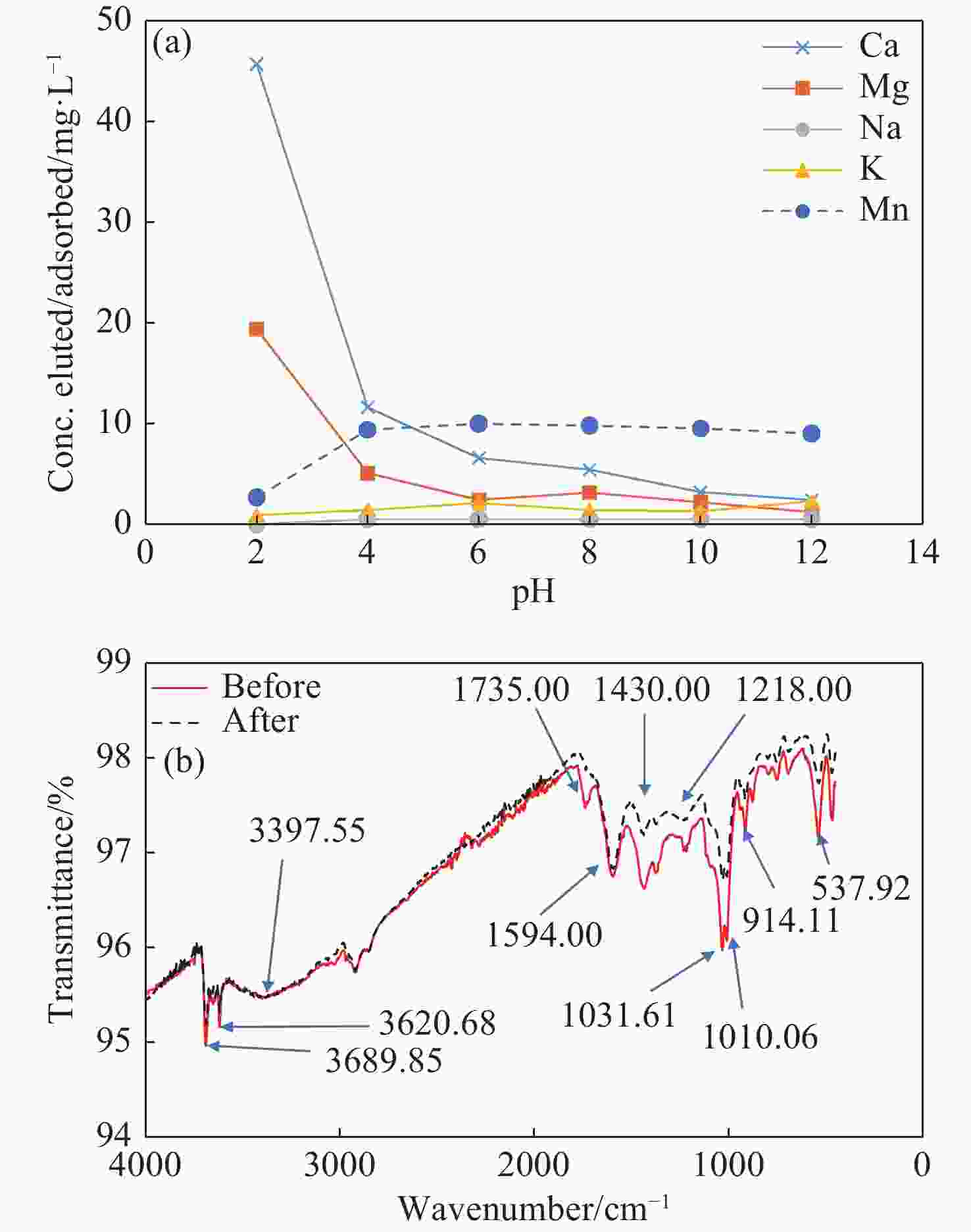 Figure  8.  (a) Net concentrations of Ca2+, Na+, Mg2+, K+ and Mn2+ eluted/adsorbed into solution at different solution pH values, and (b) FTIR spectra of the BC before and after loading with Mn2+
