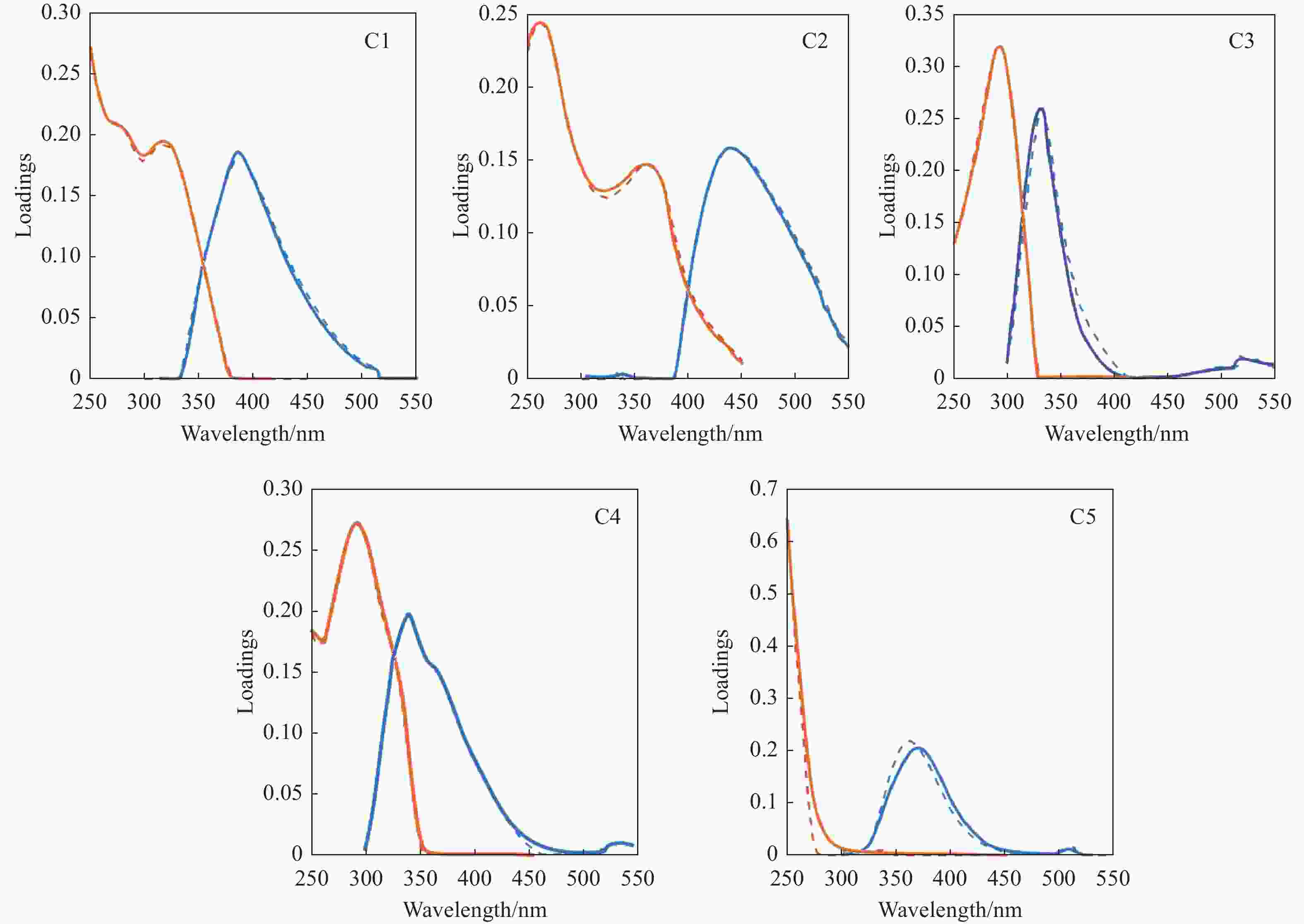 Components in this study λEx/λEm (nm) Compound type Components in previous studies C1 <250(320)/400 Humic-like 250(325) /400–425 nm (Liu et al. 2023); 245 (320)/442 nm (Yang et al. 2024) C2 255(350)/445 Fulvic acid (240–260)/(379–457) nm (Marcé et al. 2021); 250 (355)/461 nm (Ouyang et al. 2025) C3 270/320 Tyrosine-like 275/312 nm (Yang et al. 2024); 275/325 nm (Ren et al. 2021) C4 285/350 Tryptophan-like 290/345 nm (Ren et al. 2021); (275–290)/(305–351) nm (Ouyang et al. 2025) C5 <250/370 Tryptophan-like <250/338–370 nm (Marcé et al. 2021) -