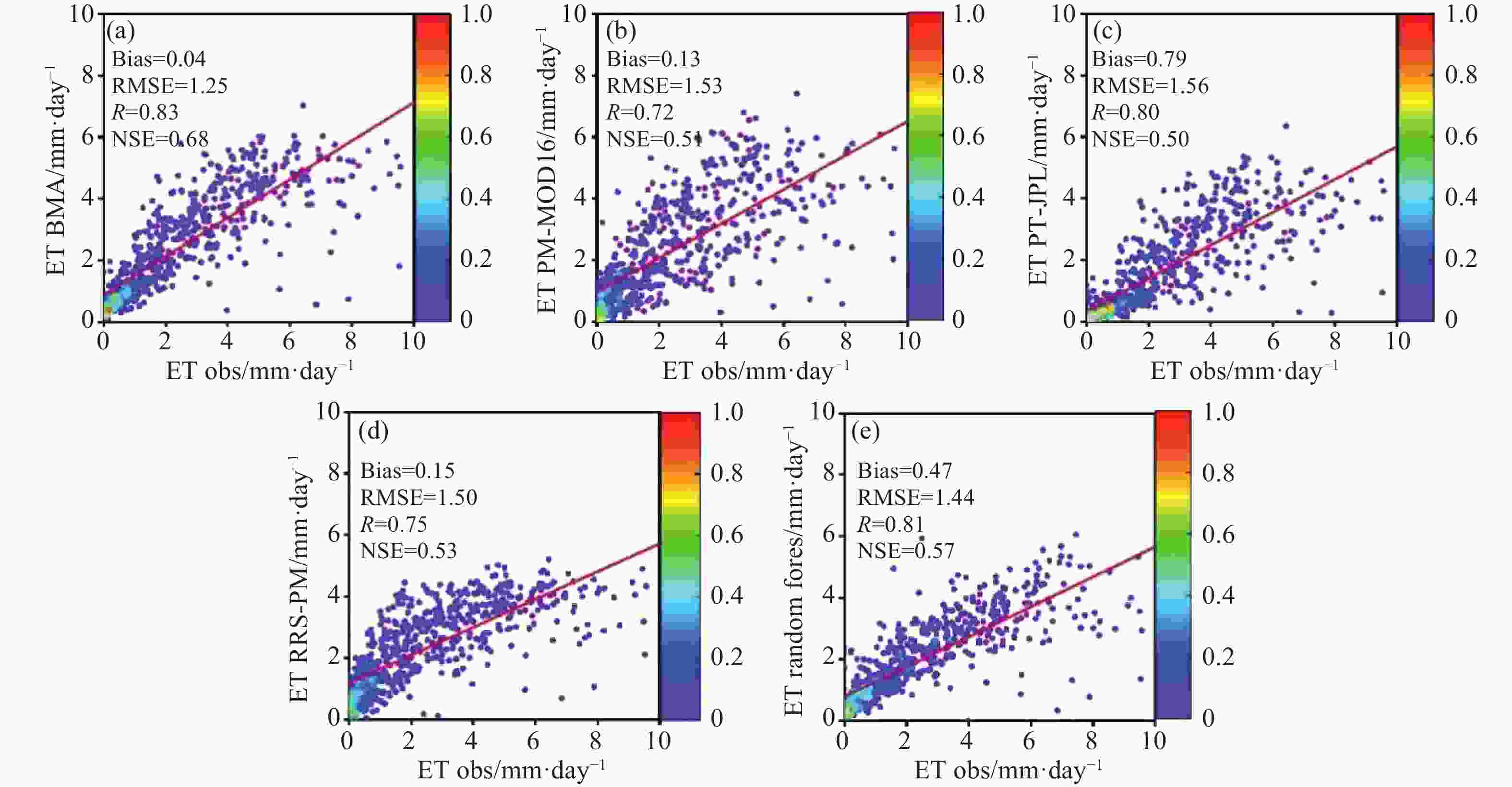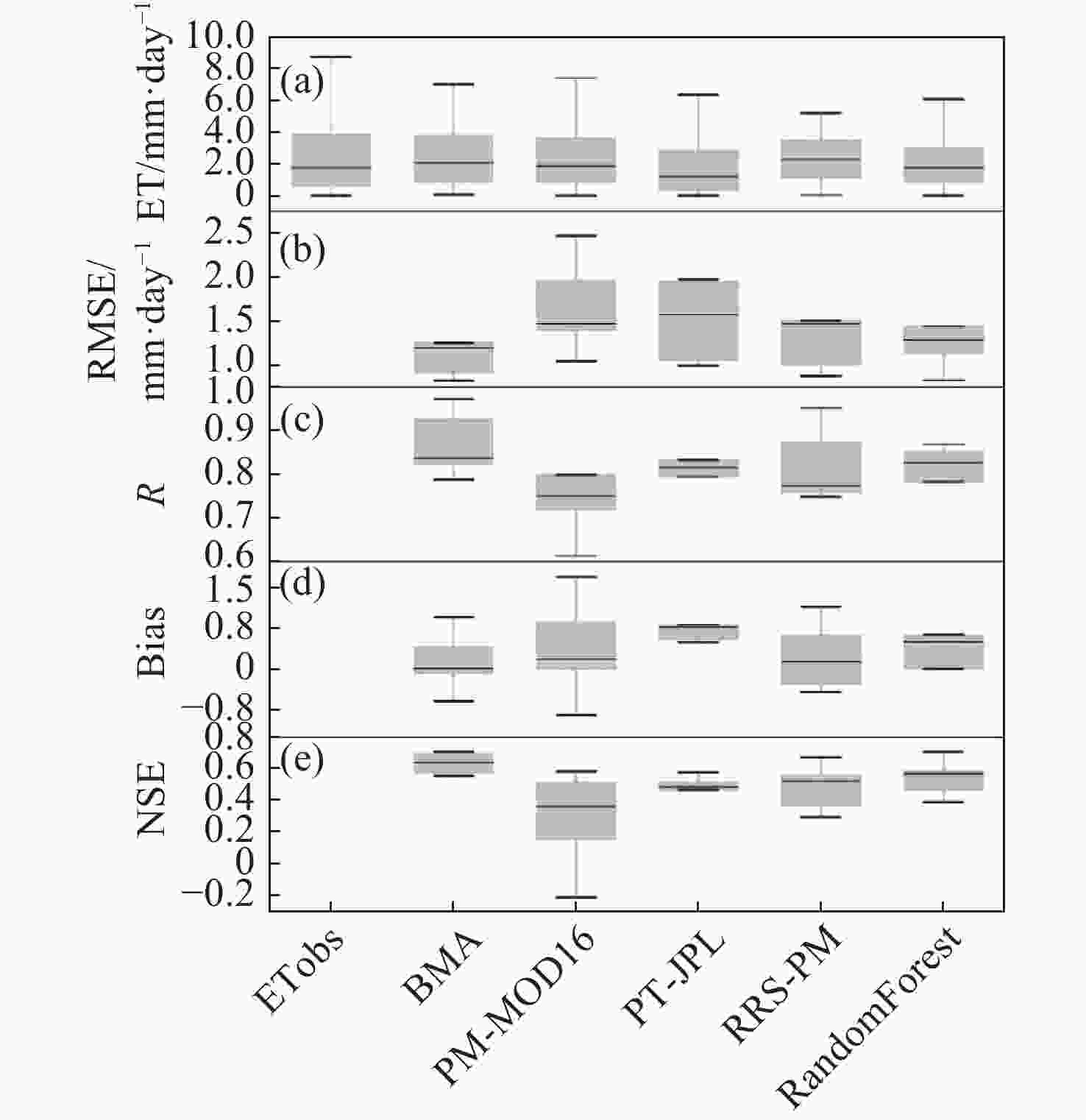 Rn (W/m2) Tm (°C) Rh (%) Ps (hPa) R 0.87 0.99 0.93 0.82 Bias 15.17 −0.06 −0.23 −3.76 RMSE 32.90 1.60 7.62 14.86 NSE 0.60 0.98 0.84 0.65 Table 4. Uncertainty analysis of BMA ET at each site.